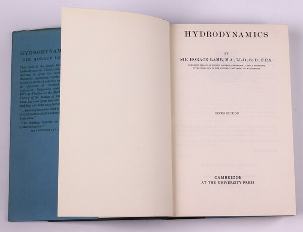 Lot 109 LAMB, Sir Horace. Hydrodynamics. Cambridge At The University Press. 8vo, 738pp. Original blue cloth, gilt lettered spine, dust cover. Sixth Edition 1932. £40-60
