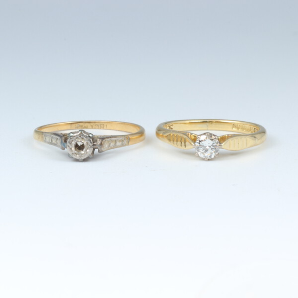 Lot 11 An 18ct yellow gold solitaire diamond ring and 1 other marked 18ct, sizes J and G, 3.4 grams £100-150
