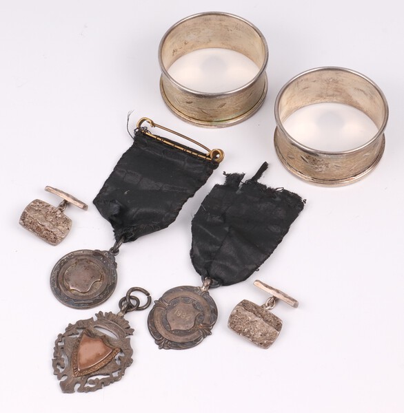 Lot 110 A pair of barked silver cufflinks, 3 silver watch chain medallions and 2 silver napkin rings 73 grams gross SOLD £60
