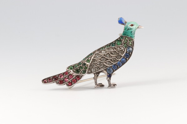 An enamelled and paste set brooch in the form of a peacock 4cm