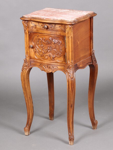 Lot 1133 A French carved walnut bedside cabinet of serpentine outline and pink veined marble top, fitted a drawer above cupboard enclosed by a panelled door, raised on cabriole supports 83cm h x 43cm w x 37cm d £50-75