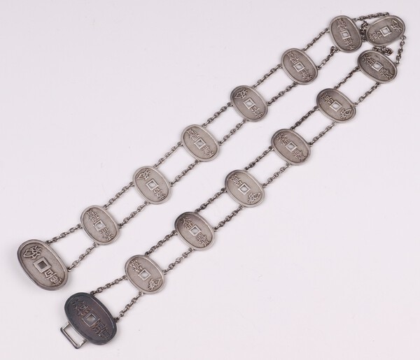 Lot 116 A Japanese Meiji Period silver belt made from silver 100 mon charms each with jungin (pure silver) mark, 69 cm, 112 grams £80-120