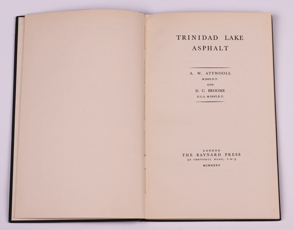 Lot 117 ATTWOOLL A. W. and BROOME D. C. Trinidad Lake Asphalt. London: The Baynard Press, 1935. Lg. 8vo, 56pp. Original black cloth with gilt lettered spine. £50-70