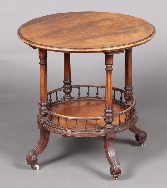 A Victorian circular walnut 2 tier occasional table with bobbin turned decoration, raised on outswept supports with ceramic casters 60cm h x 60cm diam.  £50-75