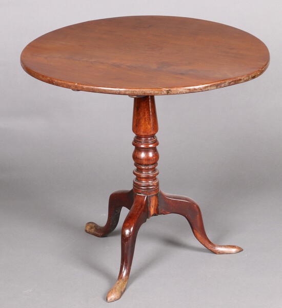 Lot 1184 A 19th Century circular mahogany snap top mahogany tea table, raised on a pillar and tripod base 70cm h x 76cm diam. £40-60
