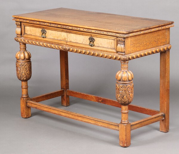 Lot 1191 Beresford & Hicks, London, a 1920's Continental style carved oak side/serving table, fitted 2 frieze drawers, raised on cup and cover supports with box framed stretcher 85cm h x 118cm w x 53cm d £100-150