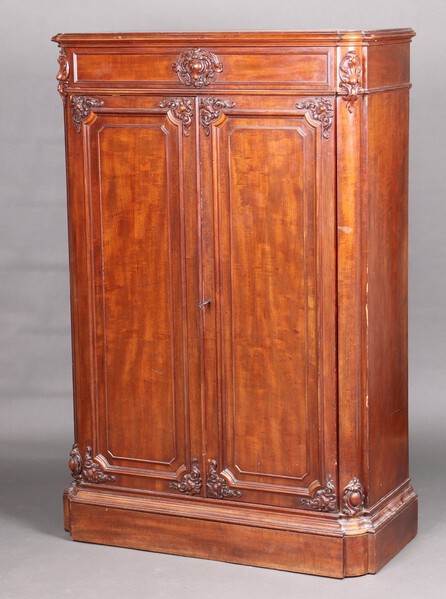 A 19th Century carved walnut "knock down" cabinet, the upper section fitted a drawer, the interior fitted a hanging rail (formerly racked for shelves) enclosed by a pair of panelled doors 189cm h x 103cm w x 46cm d  £100-150