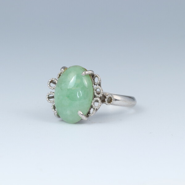 Lot 12 An 18ct white gold ring set an oval cabochon cut green hardstone, size G 1/2, 4.6 grams £120-140