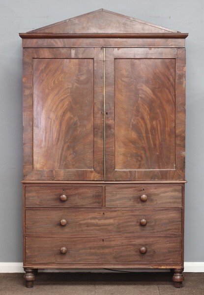 A 19th Century mahogany linen press, the upper section with moulded cornice, the interior fitted 5 trays enclosed by panelled doors, the base fitted 2 short and 2 long drawers with turned handles, raised on turned supports 224cm h x 131cm w x 57cm d