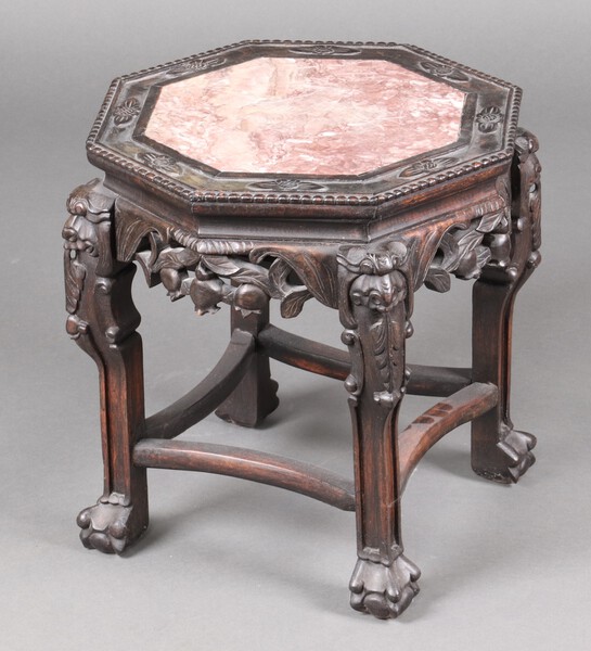 Lot 1210 A Chinese octagonal carved and pierced hardwood jardiniere stand with pink veined marble top 46cm h x 43cm w x 43cm £80-120