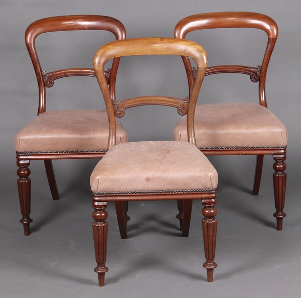 Lot 1224 A set of 3 Victorian bleached mahogany spoon back dining chairs with carved mid rails, seats upholstered in light brown leather on reeded supports £40-60