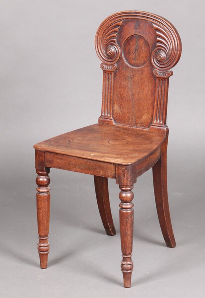 Lot 1229 A 19th Century mahogany hall chair with ionic column decoration to the side, solid seat, raised on turned supports £40-50