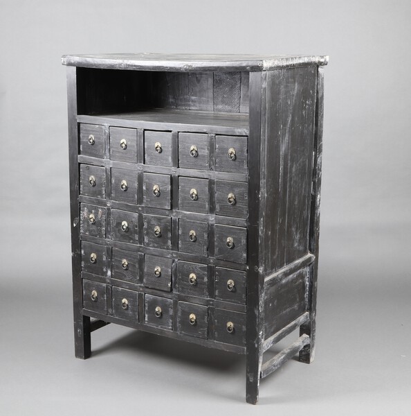 Lot 1241 A 19th Century Chinese ebonised medicine chest with recess above 25 drawers each with ring drop handles 128cm h x 91cm w x 54cm d £150-200