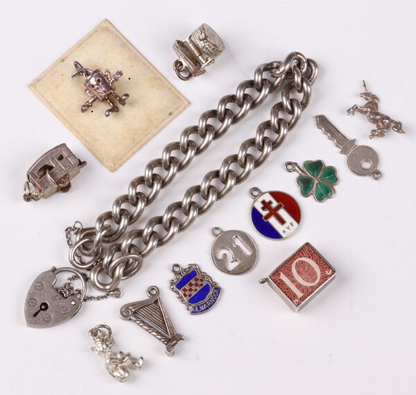 Lot 128 A silver curb link bracelet with padlock clasp 18cm, 53 grams together with 12 loose charms, 19 grams gross £60-80