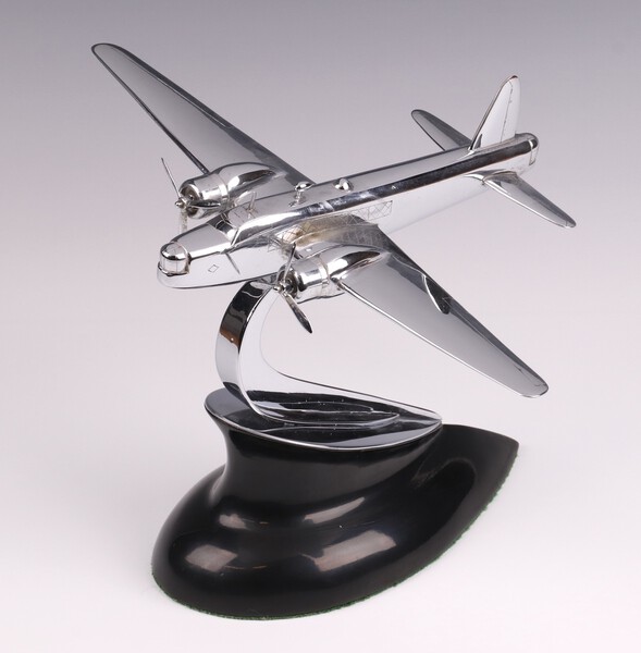 Lot 129 A polished chrome model of a Vickers Wellington Bomber in flight with rotating propellers, on a shaped black acrylic base, visible on Sir Barnes Wallis' desk in public photos 16cm h x 20cm w x 26cm d £300-400