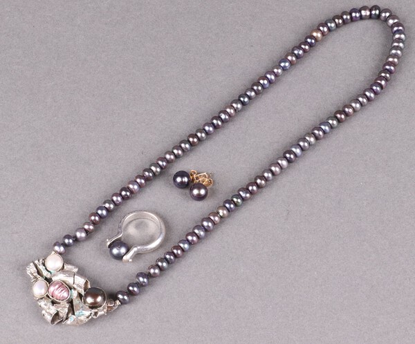 Lot 131 A string of purple pearls with silver pendant, a silver ring set a swivelling pearl and a pair of gold marked 585/15k pearl set earrings £50-75