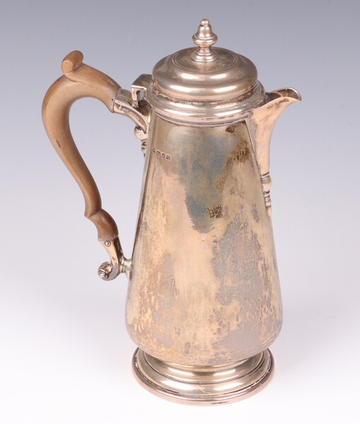 Lot 131 A Queen Anne style silver hot water jug of tapering form with beech handle, London 1931, by D & J Wellby, 629 grams gross SOLD £480