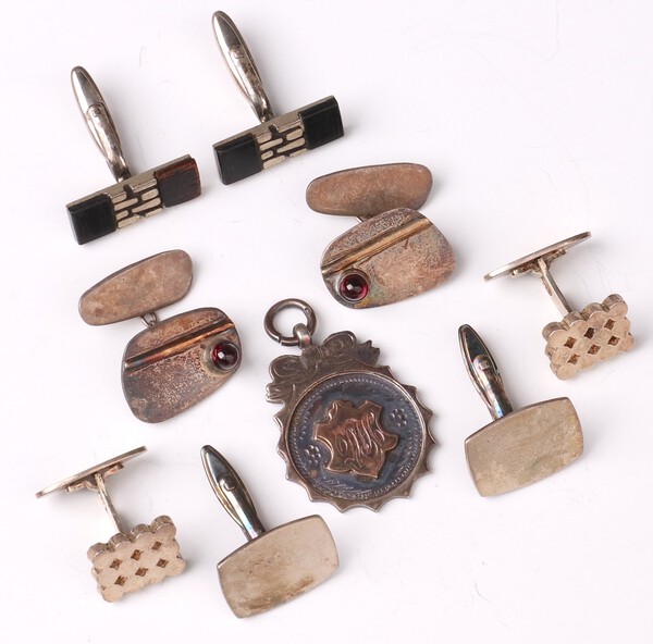A silver watch chain medallion and 5 pairs of silver cufflinks, 54 grams