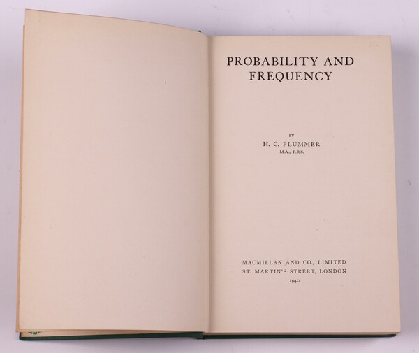 Lot 132 PLUMMER, H. C. Probability and Frequency. London: Macmillan and Co., 1940. 8vo, 265pp. Original green cloth, gilt lettered spine. Minor rubbing to corners and edges of spine. Initialled B.N.W. Dec. 1940 £80-120