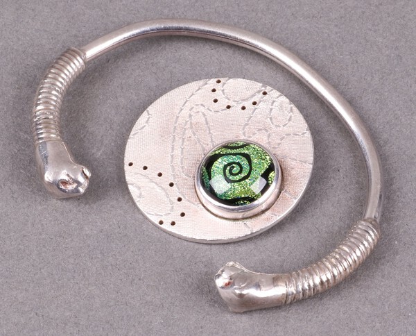 A silver bangle with leopard head ends and a stylish silver pendant, 30g gross