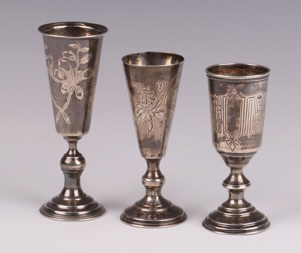 Three Russian engraved silver Kiddish cups marked 84, 96 grams
