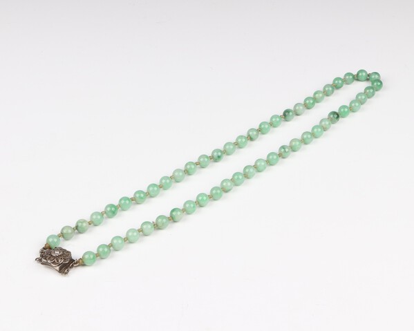 A Chinese 1920's/1930's jade necklace with silver clasp