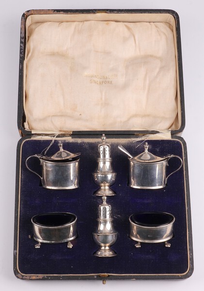 A 6 piece Georgian style cased oval silver condiment set with pair of salts, pair of mustard pots (1 with spoon) and a pair of peppers, complete with blue glass liners (1 cracked), Birmingham 1922 by Adie Brothers Ltd., 150 grams