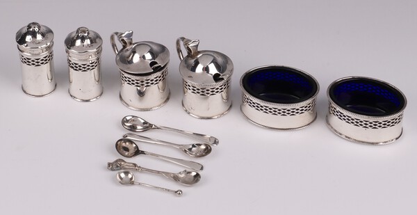Lot 137 A 6 piece silver condiment set comprising pair of peppers, pair of salts and pair of mustard, with blue glass liners and spoons, Birmingham 1925 by Levi & Salaman, 150 grams together with 5 various salt spoons £130-160
