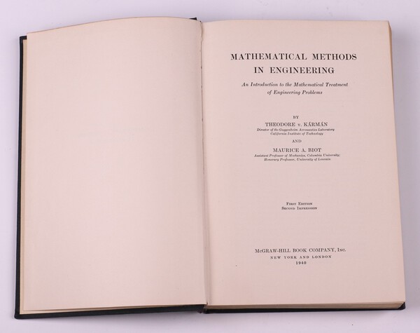 KARMAN. Theodore V and BIOT, Maurice A. Mathematical Methods in Engineering. New York and London: McGraw-Hill Book Company, Inc. 1940. 8vo, 505pp. Original black cloth, gilt lettered spine. Minor rubbing to corners and edges of spine. First Edition, Second Impression. Initialled B.N.W. 1940. Handwritten pencil notes with diagram to the back page