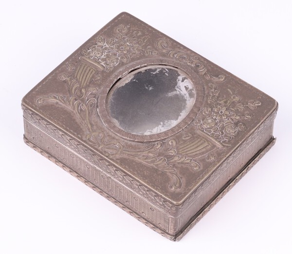 Lot 138 A 19th Century Continental engraved silver box, the hinged lid embossed cornucopias and with glass panel to the centre, 3.5cm x 8cm x 6cm, 128 grams gross £50-75