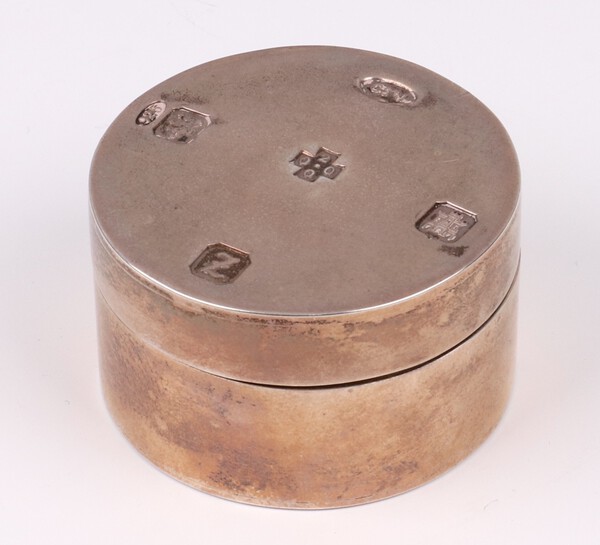 Lot 143 A cylindrical silver jar and cover Edinburgh 1999 with millennium hallmark by Christian St John, 77.7 grams £50-70