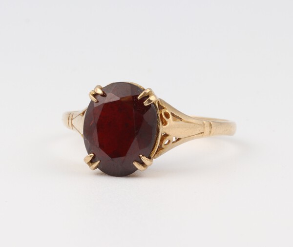 A 9ct yellow gold garnet set ring, size O 1/2, 2 grams