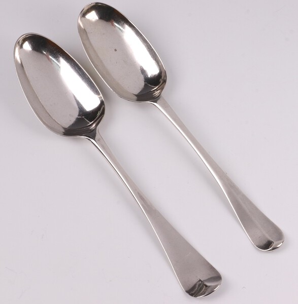Lot 145 A George II silver bottom mark spoon, with shell back, engraved W*T S*M, London 1755, by Ebenezer Coker, a George I ditto, engraved EM, London 1725 by Hugh Arnett & Edward Pocock, 113 grams £80-120