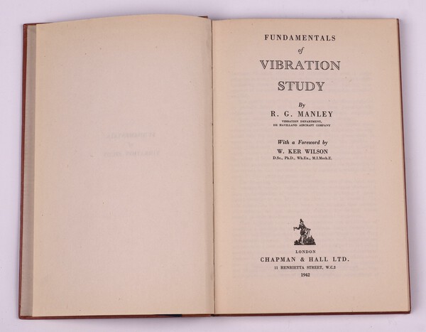 Lot 146 MANLEY R.G. Fundamentals of Vibration Study. London: Chapman & Hall Ltd. 1942. 8vo, 128pp. Original red cloth, gilt lettered spine. Some fading to spine, minor rubbing to corners. First Published 1942. Initialled B.N.W. Sept. 1942 £100-150