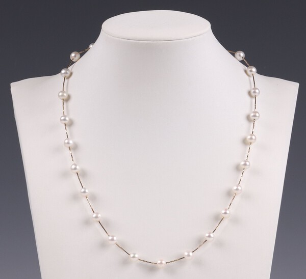 A yellow gold, marked 14k, gold and interspersed pearl necklace gross weight 7.9 grams