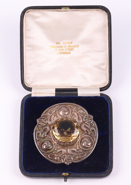 A Scottish silver plaid brooch decorated a mythical beast set citrine to the centre, the reverse engraved Caledonian Society of Horsham, presented to Mr David Brice, Honorary Secretary 1908-1913 as a mark of esteem December 31st 1913, Glasgow 1913, maker Thomas Kerr Ebbutt, 127 grams gross, with fitted case