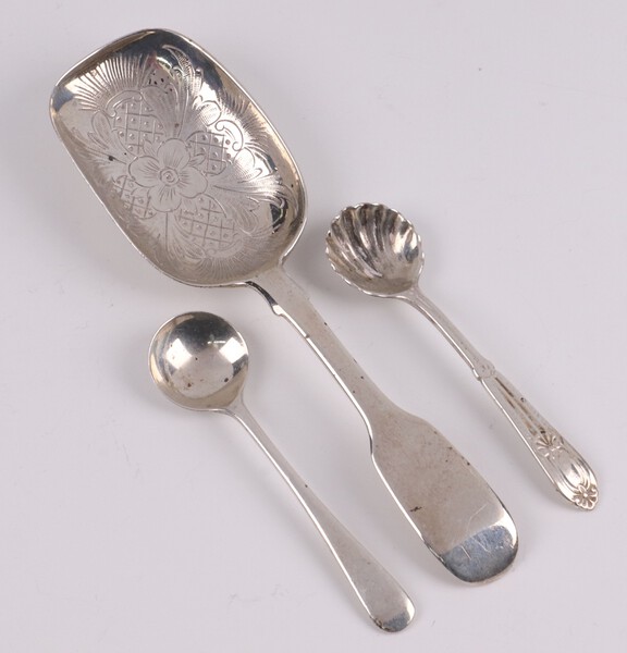 Lot 152 A Victorian silver fiddle pattern caddy spoon with engraved rectangular bowl, London 1848 by Jacob Wintle together with 2 silver salt spoons, 25 grams £30-40