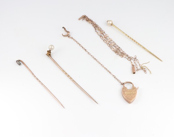 Lot 154 A 9ct gold belcher link chain (a/f), a 9ct gold padlock clasp, 3.2 grams and 2 stick pins £80-120