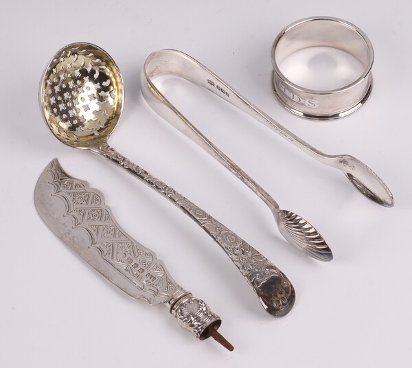 A William IV engraved silver Old English pattern sifter spoon, London 1837, a Victorian silver bladed butter knife Birmingham 1865, a pair of silver sugar tongs Sheffield 1912 by Mappin & Webb and a silver napkin ring Birmingham 1957, 126 grams