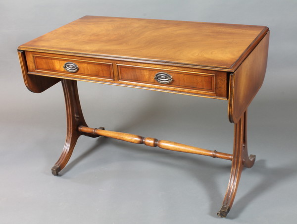Lot 154 A George III style mahogany sofa table, yew wood crossbanded fitted 2 frieze drawers, raised on splayed moulded supports united by a turned stretcher, brass caps and casters 29.5"h x 59.5"w x 22"d SOLD £150