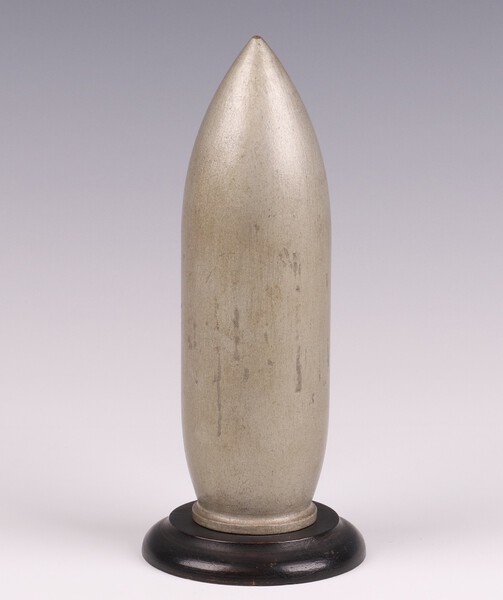 A wooden model of The Grand Slam Bomb (medium capacity) 22,000 LB (10,000 kilogrammes earthquake bomb) raised on a turned wooden stand 17cm x 7cm. The Grand Slam was the second bomb Wallis designed after the success of the bouncing bomb. The bomb was even larger than the Tallboy and there was still no aircraft capable of lifting it to its optimal altitude. Like the Tallboy it could be dropped from a lower height and would enter the earth at near supersonic speed, penetrating to a depth of up to 20m before exploding. The Grand Slam was also used on strategic German targets such as V-2 rocket launch sites, the V-3 supergun bunker, submarine pens and the battleship Tirpitz, as well as large civil constructions such as viaducts and bridges.