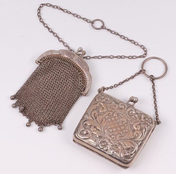 Lot 155 An Edwardian embossed silver purse with fitted cloth interior, Birmingham 1908, makers marks rubbed, together with a mesh purse £50-70