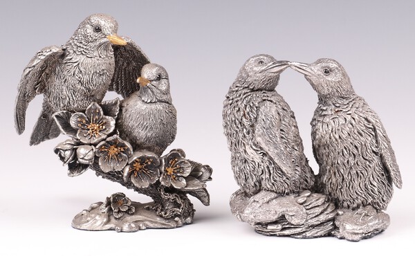 Lot 156 A Country Artists Sterling silver filled hallmarked figure of 2 standing penguins 8cm and 1 other of 2 birds 10cm £60-80