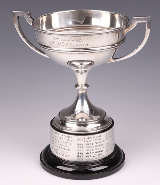 Lot 159 A silver twin handled presentation cup Birmingham 1928, marks rubbed, 257 grams including screw and potential weight to the base £220-260