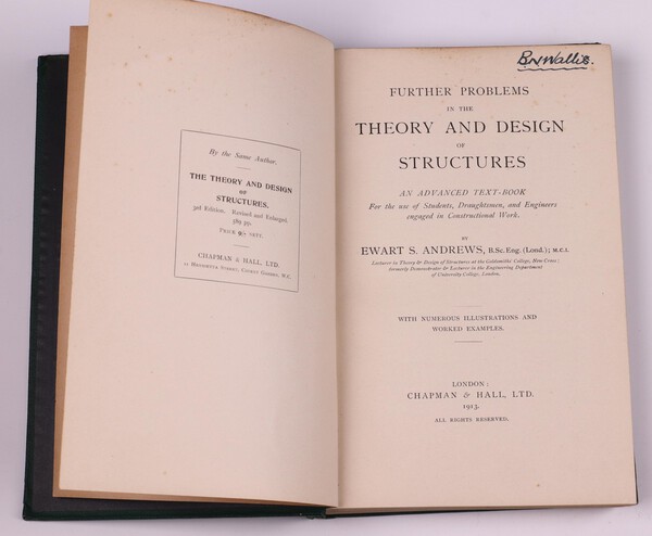 The letter is dated 30th December 1921 and reads Dear Mr. Wallis, I have now had time to look at the treatment that you were good enough to send me with regard to the rolling load problem on page 186 of my book. With regard to your query as to whether c = b should be c = l, I think it is correct as printed because it is assumed that the point is between the load W2 and the resultant. The remainder of your treatment seems to me to be perfectly sound and I have filed your note with a view to incorporating it in a revised edition of the book. I would like to take this opportunity of congratulating you on the uniform excellence both in finish and treatment of the work which you have sent to me for correction through the U.C.C. Yours sincerely, (signed) Ewart. S. Andrews Museum reference 1992/0392/G/U/4