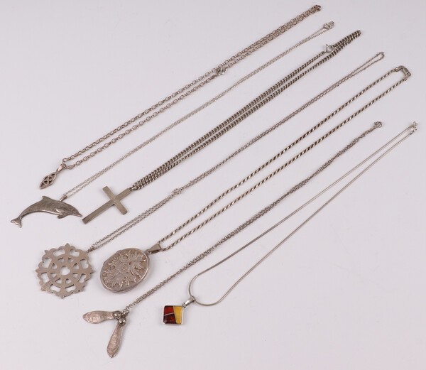 An engraved oval silver locket pendant hung on a silver chain, a pierced silver pendant on chain, an engine turned silver cross on chain, a Celtic charm on a silver belcher link chain, a pendant in the form of a sycamore seed and a silver enamelled pendant on chain 90 grams gross