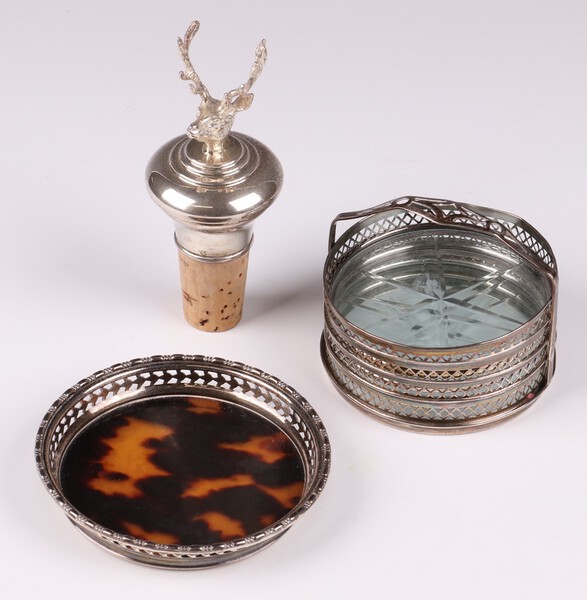 A circular pierced silver and tortoiseshell pin tray Birmingham 1946 8cm, a silver bottle stopper in the form of a stags head Birmingham 1998, 3 pierced Sterling silver and cut glass coasters on a stand (1 with crack to base, all misshapen)