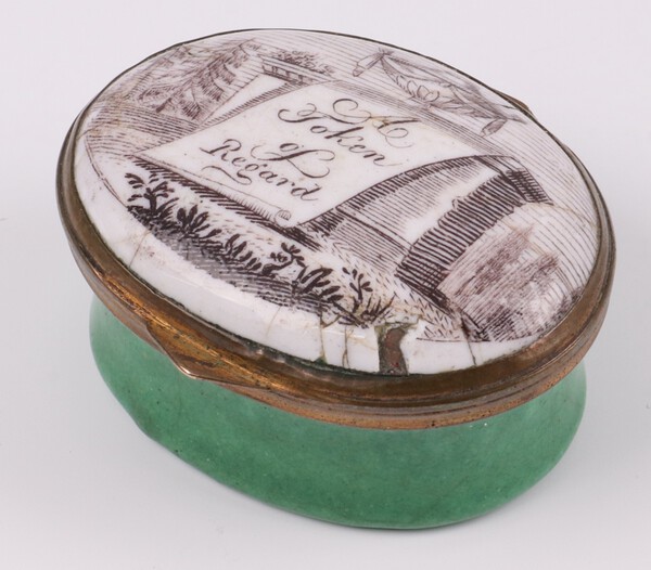 Lot 164 An 18th Century oval Bilston enamel patch box, the lid marked "A Token of Regard" the interior fitted a mirror (mirror cracked) 12cm x 4cm £50-75