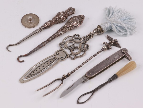 Lot 172 A 925 silver golf ball marker, a miniature folding pocket knife with silver grip Birmingham 1947 5cm, 2 miniature silver handled button hooks, a metal fork and a pierced metal bookmark £40-60