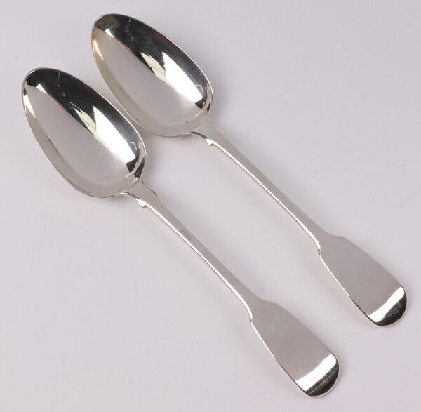 Lot 174 A pair of George IV silver fiddle pattern table spoons London 1825 by William Chawner II, 136 grams £90-120